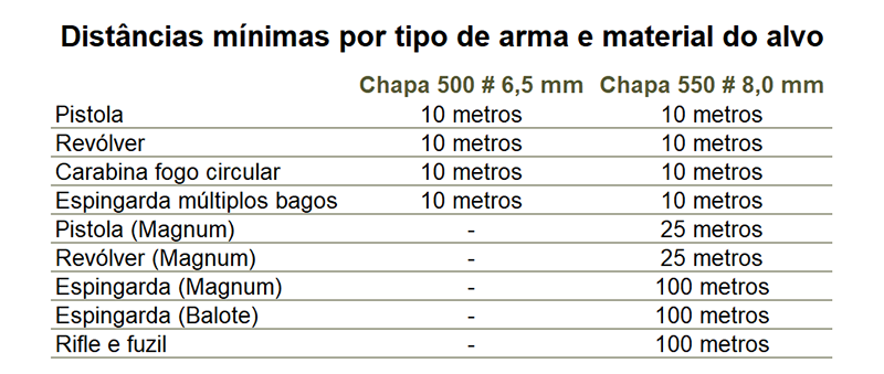 Para aumentar a segurança na utilização e a durabilidade dos alvos, recomendamos que sejam respeitadas as distâncias mínimas e material adequado ao tipo e arma/calibre.